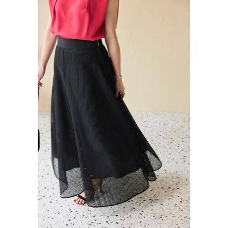 メッシュレースで仕立てた軽やかなムードのスカート。ハイウエストから裾に向かってたっぷりと広がるシルエットで、動くたびに裾が上品に揺れるフレアスカート。太めのウエストの切り替えデザインがスタイリングにメリハリを与えます。一枚でスタイリング全体がパッと華やぐスカートですが、同素材のブルゾンと合わせたセットアップデザインも更におしゃれ感が増しておすすめです。