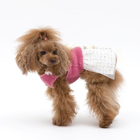 身頃生地は肌触りの良い毛足のあるファー生地を使用し、レースとパールモチーフ&リボンでネックレス風に見立てたおしゃれなワンピースです。ツイードスカートには中心にパール釦を施し、左右の切替部分にはチュールを重ねて変化を持たせました。ネックレス部分のストーン付きの揺れるパールもオススメポイントです。