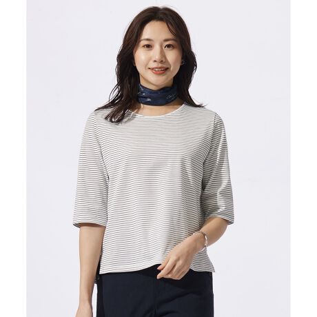 すっきりとした袖で羽織インナーとしても使いやすい、洒落感のあるボーダーのカットソー。細いラインの細ピッチの大人な印象で、毛羽が少ない生地でサラッとした綿の風合いを引き出しています。ほのかな輝きを放つラメ糸で入れた、襟元の千鳥ステッチがポイント。サイドスリットや前後差のあるデザインで、タックインでもアウトでも着用可能です。ベーシックな無地のカットソーもご用意しています。カラーは、他アイテムとも相性の良いホワイト×ネイビー(#101)の1色展開です。