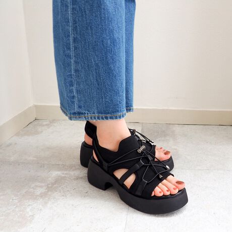 黒を効かせた配色でコーディネートの引き締め役になるカジュアルサンダル。流線型のボリュームソールが足元にインパクトを与えてくれます。