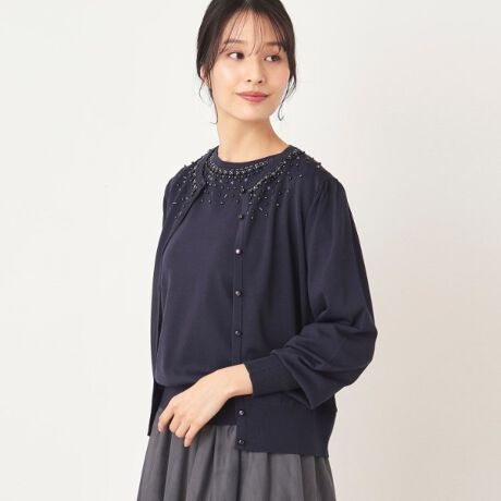 ネックラインにパールと数種類のビーズを使った手刺繍がポイントのニットカーディガン。
