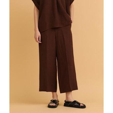 すっきりとしたシルエットのワイドクロップドパンツ。ウエスト周りをすっきりと見せつつ、後ろゴム仕様にすることで穿き心地の良さをプラスしました。程良い分量感とセンタープレスでつくるすっきりとしたシルエットとシンプルなディテールで汎用性の高いデザインに仕上げました。春夏にふさわしい麻レーヨン素材を使用。風通しが良くて蒸れにくく、汗をかいても貼りつかないさらっとした着心地が特徴です。麻の質感を残したカジュアル過ぎない上品な印象となっています。・水洗い可・裏地無し・ポケットあり・ウエスト後ろ部分ゴム仕様■サンプル撮影商品■こちらの商品はサンプルでの撮影となっております。実際の商品とは、サイズや色味、素材、デザイン等の仕様が若干変更になる場合がございます。