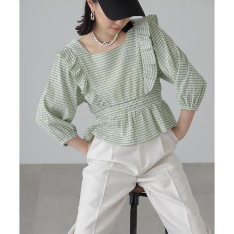 昨年ご好評いただいたブラウスを今年らしくアップデートしました!肩フリルとペプラムに加え、ウエスト部分にシャーリングデザインをプラスし、メリハリのあるシルエットに仕上げています。スクエアネックで首元にはすっきりと抜け感をだし、身頃は程よくゆったり目でカジュアルな雰囲気に。ボリュームスリーブの袖口はゴム仕様なので、たくし上げて袖丈を調整すると夏まで活躍できます。デザインが凝ったブラウスなので、デニムパンツやスカート合わせでシンプルなスタイリングがおすすめです。※モデルの着用画像の場合、光の当たり具合により、実際の色味と異なって見えることがございます。色味は、商品単体の画像をご参照ください。