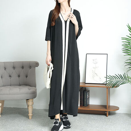 センターのカラーに切り替えが目を惹くニットワンピースの登場です。深めのVネックで首元すっきり、裾のスリットで女性らしさをプラス☆Iラインのキレイなシルエットで着やせ効果も抜群です。シンプルなデザインで羽織りとの相性も良くこなれた大人カジュアルコーデが完成します。