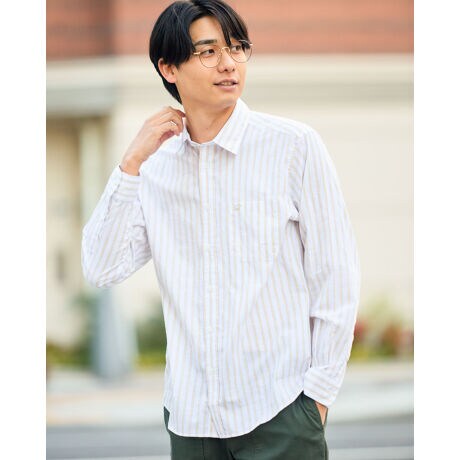 ストライプのレギュラー襟シャツです。涼感のある綿麻混素材を使用しています。麻のナチュラルな表情と、さらっとした肌触りが特徴です。羽織りとしても、インナーとしても活躍する1枚です。