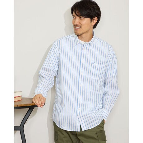 接触冷感性に優れたストライプのレギュラー襟シャツです。タテ糸に強撚糸、ヨコ糸に綿麻素材を使用しています。白場の単色ストライプが涼感ある爽やかなコーディネイトを演出します。羽織りとしても、インナーとしても活躍する1枚です。