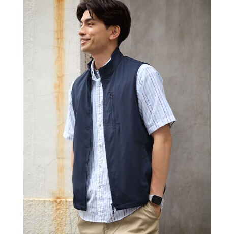 スポーティに仕上げたZIPベストです。ポリエステルのリップル素材を使用しています。凹凸感があり肌に張り付きにくく、さらっと羽織れるのが特徴です。胸と腰にはポケット付きで利便性も十分です。ご家庭でのお洗濯が可能で、長く着用いただけます。