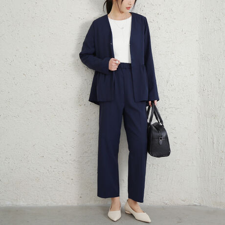 ノーカラーのデザインとゆとりを持たせたシルエットで、カチッとしすぎずこなれ感のあるスタイルに。