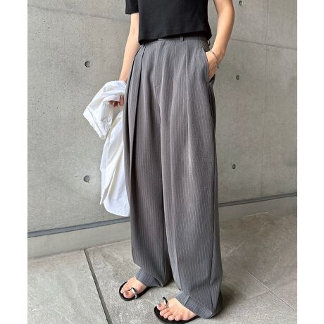 無地 ストライプ 2タック スラックス ワイド パンツ