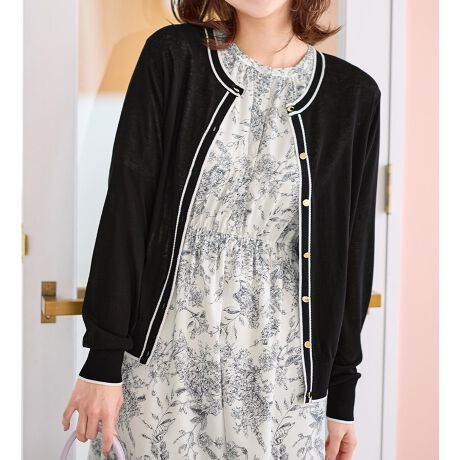 首回り・前立て・袖口・裾に配色デザインを施した、サマーニットカーディガン。