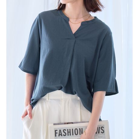大人っぽく装えるスキッパー衿のデザインブラウス。
