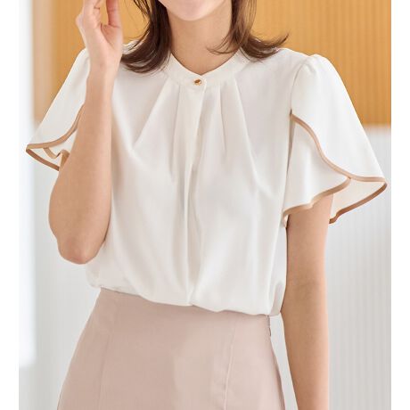 衿元は開閉可能な金ボタン付きで、オフィスにも着やすいデザイン◎