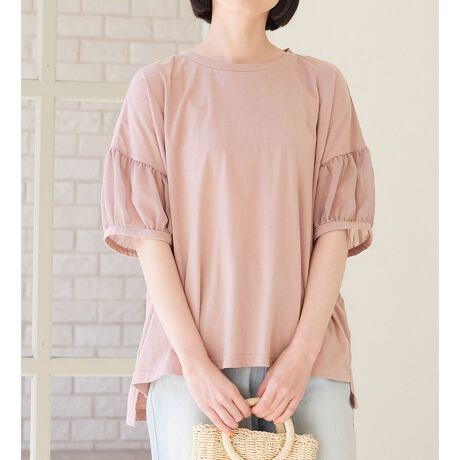 接触冷感・吸水速乾・UV対策・抗菌防臭・保湿加工の機能がついた綿混カットソーで、肌に優しく夏でも快適な着心地に。袖部分はシフォン素材の切り替えデザインで涼し気な印象に。ギャザーの入ったランタンスリーブで可愛らしく着こなせます。ゆったりシルエットで着心地も楽ちんです!