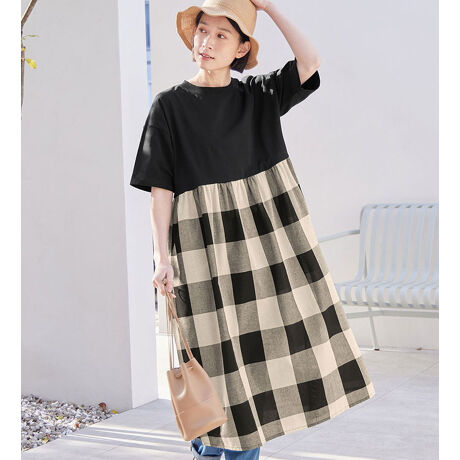 カットソーとチェックのスカートがくっついたドッキングワンピ。