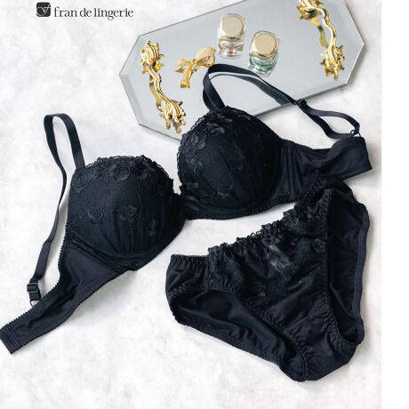デコルテUP&安定感が魅力のパターンを使用したデザイン違いのブラックを集めたブラ&ショーツSET。刺繍レースを贅沢に使った総レース、スタイリッシュな部分レース、限りなくシンプルなバッククロス&フロントホック。