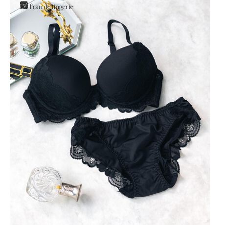 デコルテUP&安定感が魅力のパターンを使用したデザイン違いのブラックを集めたブラ&ショーツSET。刺繍レースを贅沢に使った総レース、スタイリッシュな部分レース、限りなくシンプルなバッククロス&フロントホック。