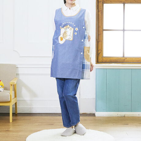 かぶり型のエプロンです。横がボタンだから着脱しやすい♪大きなポケットも便利です♪着丈約83cm