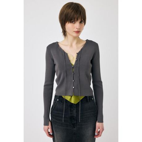 【LOOP ACCENT KNIT CARDIGAN】襟ぐりのループディティールがポイントのVネックカーディガン。ループに通したリボンはフロントで結んだり、垂らしたりと、アレンジ次第で表情が変わります。今季はホルター風に首の後ろで結ぶのがお勧めです。第一釦を外してデコルテをあえて見せる着こなしは、顔回りがすっきりし、抜け感を演出します◎■透け感:なし■光沢感:なし■伸縮性:あり■裏地:なし