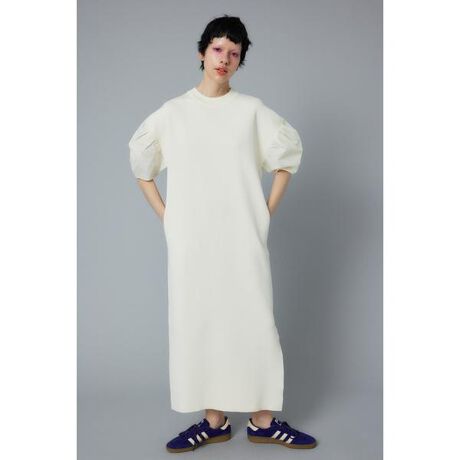 ぎゅっと目の詰まった見え方で上品な印象を与えてくれるニットワンピース。さらっとしたニット素材をハーフミラノ編みで仕立てた一枚で、程よい厚みを出しています。袖には光沢感のある布帛を組み合わせることでエレガンスさを強調しています。より上品な印象を与えてくれる一枚に仕上がりました。ドッキングタイトドレス