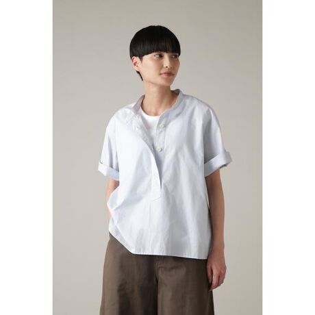タテ糸にコットン、ヨコ糸にコットンラミーの混紡糸を使用したタイプライター素材のシャツ。やや細番手の糸を高密度に織り上げることで、薄手ながら張りのある肌触りを表現。反発性のあるラミー特有のドライなタッチは湿度の上がる夏に適した素材。ノーカラーのリラックスしたフィットにワイドヘムが印象的なハーフスリーブのデザイン。