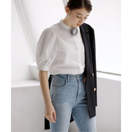 ふわっと立体感のあるスリーブとフロントに配したパールボタンが、女性らしく上品なスタイリングへ導きます。