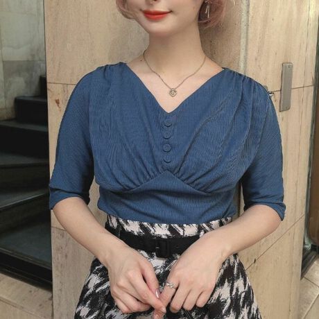 深いVネックの衿ぐりにショルダーからバストにかけてギャザードレープが入ったクラシカルなカットソー。