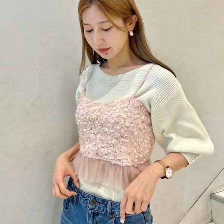 トレンドのレイヤードスタイルに欠かせないビスチェは立体的なレース×チュールの軽やかな素材感がフェミニンな仕上がりでクラシカルコーデに合わせやすいデザインにいたしました
