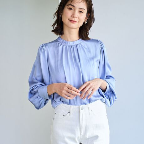 ほんのりボリュームをもたせた袖はシンプルながらも、細かいギャザーや長めのカフスで気になる腕ラインをカバーします。