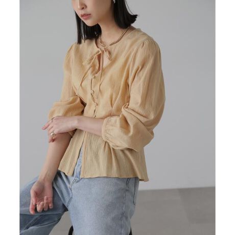 襟ぐりのキーネックから続くリボンディテールがポイントのブラウス。リボンは結んでも垂らしても可愛らしく決まります。袖はボリュームがあり、女性らしさをプラス。長めのチュニック丈に、前ボタンを途中までつけているため、裾はスリットのような仕上がり。ウエストはタックですっきり見えるシルエットにし、ミニスカ合わせで女っぽくきるのがおすすめ。ワイドパンツやデニムパンツ、カーゴパンツ合わせでカジュアルな着こなしも今の気分にぴったりです。ナチュラルな雰囲気のワッシャー加工を入れたコットン素材を使用。※モデルの着用画像の場合、光の当たり具合により、実際の色味と異なって見えることがございます。色味は、商品単体の画像をご参照ください。