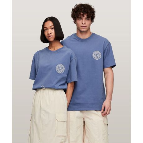 フロントの胸もとには刺繍で、バックスタイルには大胆なプリントで、クレストモチーフが施された半袖クルーネックTシャツです。綿100%のしっかりとした生地感で、一枚着でも安心。肩の切り替えをドロップしたリラックスフォルムにより、モダンな表情も感じられる仕上がりとなっています。単品でのシンプルな着こなしの他、インにロングスリーブTシャツを重ねたりと、ロングシーズン活躍するアイテムです。