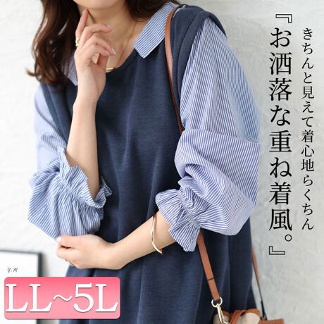 ストライブシャツとカットソーのフェイクレイヤードトップスの登場です。1枚でコーデが決まるので着ぶくれも感もなくすっきりと着用していただけます。身幅に余裕を持たせたシルエットでリラクジングな着心地です。ヒップも隠れる丈感で体型カバー力も抜群です。ボトムも選ばずコーデが楽しめます。幅広い年齢の方にお勧めです。