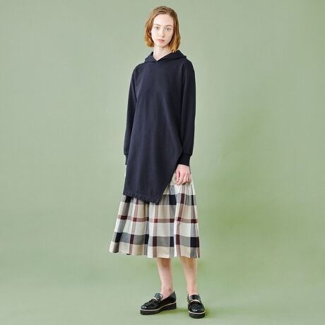フーディータイプのチュニック丈トップスとスカートがセットになったレイヤードドレスです。