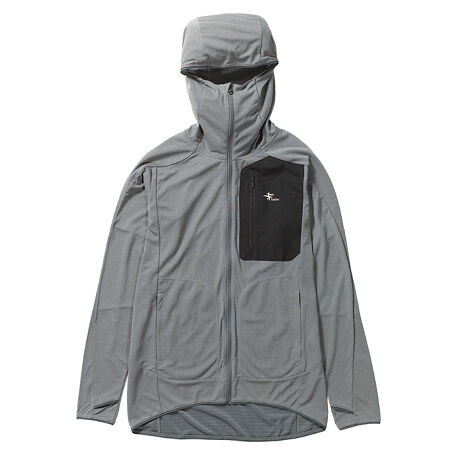 アウトドアでのアクティブな使用環境に対応するフルジップフーディ。防虫成分を表面のみにドット状にプリントする新技術「ドットオン加工」により、従来のパディング(ドブ漬け)加工よりも素材の柔らかさや通気性を確保しつつ、しっかりと防虫効果を発揮します。肩から肘にかけてのヨークは2重生地にして補強。動きによる耐性を高めました。防虫、吸汗速乾、UVカット機能を持つトランスウェット・スコーロン素材に接触冷感機能もプラスし、盛夏でもよりサラッとした着用感をキープ。フードは開口部が少ないバラクラバタイプで、顔の周りをしっかりとガードします。袖口はサムホール付きで、手の甲の虫や日焼け対策も万全なより機能的なアイテムです。