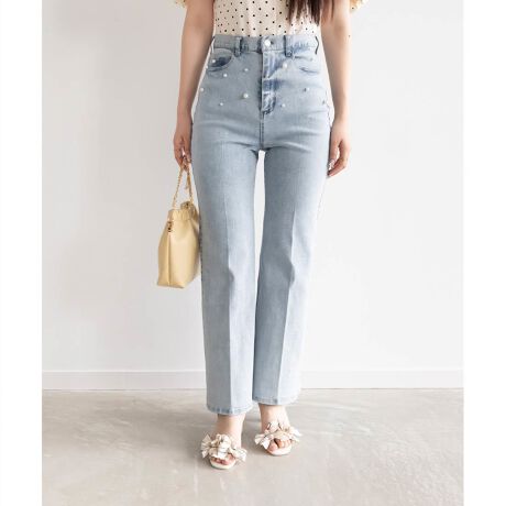美脚効果抜群のセミフレアシルエットのデニムパンツにパールをランダムに散りばめたトレンド感のあるアイテム。
