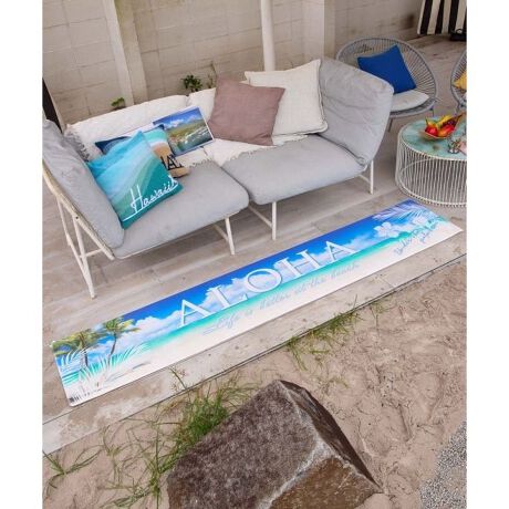 [型番:42UP2251-2024]プルメリアやホヌなどハワイを代表するモチーフを描いたPVCマット。230cmサイズは広めのキッチンやリビングにぴったり。防水仕様でお手入れ簡単、やわらかな踏み心地で長時間の立ち仕事にもおすすめです。裏面滑り止め加工付き。裏面滑り止め加工