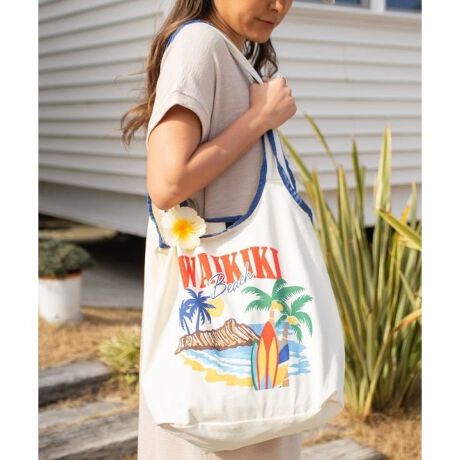 [型番:42VP3201-2024]ハワイらしいグラフィックをプリントした綿天竺素材のトートバッグ。カラフルなTシャツをそのままバッグにしたような遊び心あるデザイン。ゴムバンドが付いているので丸めて束ねてエコバッグにも。