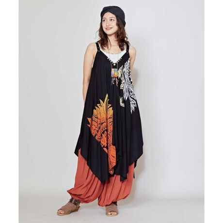 裾のボタンを閉じればサロペットとしても使える、大人気の2WAYワンピース。心奪われるトライバル柄。対角線上に描かれたトライバル柄がクールさを演出。胸元のメタルパーツできらびやかな印象に。さらっとしたレーヨンが肌に心地よく、インナーと合わせて楽に着られる一枚。肩紐で3段階の長さ調節が可能。風に揺れるシルエットに心が躍る。