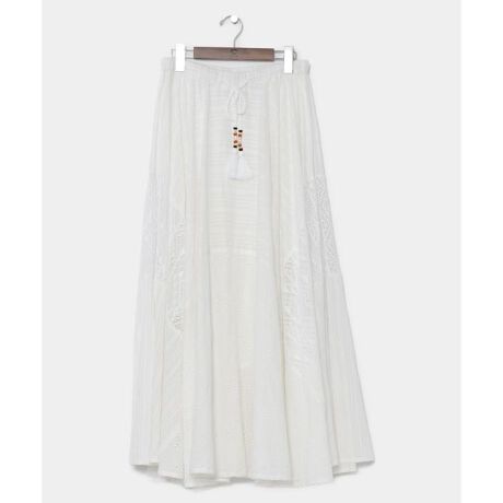 [型番:IDS-3141-2024]贅沢なボリューム感がふわりと揺れるフレアスカート。ワントーンでありながら様々なレース生地が散りばめられ、豊かな表情を見せる。ウエストはゴムと紐で調節可能。裏地付き。ウエスト紐の大きめのタッセルとビーズもポイント。シンプルな中にもこだわりが詰まった、コーディネートを華やかに彩る一枚。