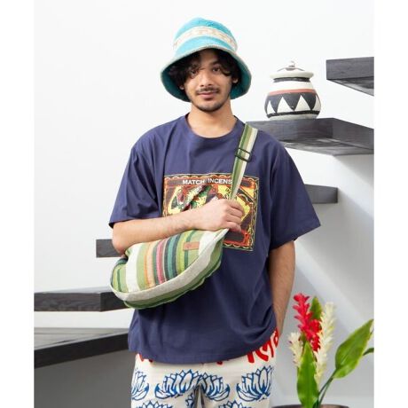 [型番:NQTP5122-2024]長年愛されるネパールの手織りボーダー生地を使った三日月形ショルダーバッグ。内ポケット付きで荷物の整理がしやすいのもポイント。ピタッと体のラインにフィットして、使いやすさ抜群。職人の息遣いと共に織りあがる、ざっくりとした生地の風合いをお楽しみください。