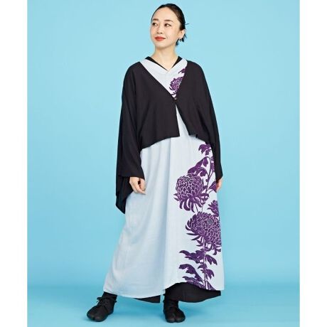 さらりとした肌触りのワンピースと羽織のセットアップ。立ち昇るように描かれた大輪の菊の中には吉祥紋麻の葉が。UVカット加工が施された羽織は、短丈で着物のような大きめな袖が特徴的。お手持ちのお洋服とも合わせやすい色合いの羽織です。