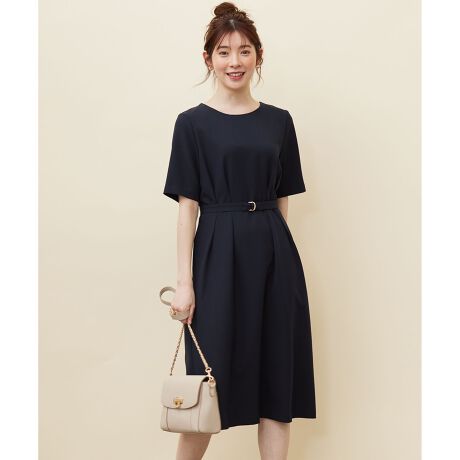 ■デザインウエストにタックの入った程よいフィット&フレアシルエットのワンピースです。通勤にぴったりなシンプルな5分袖のデザイン。ウエスト切り替えが無いので背丈を選びません。取り外し可能なベルト付きでウエストマークも可能。同素材のショートジャケットとのスタイリングもおすすめです。