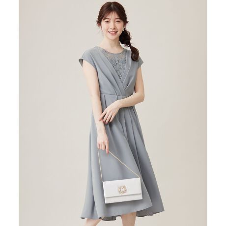 ■デザインカシュクールディテールが女性らしさを引き立たせるフィット&フレアシルエットのドレスです。胸元にレースを用いることで華やかさプラス。胸の開きも気にせず安心して着用できます。スカートはフロント部分を引き上げることで抜け感をプラス。長めのフレンチスリーブで肩周りの露出を抑えられるのも嬉しいポイントです。後ろウエストはゴム仕様なので楽な着心地に仕上がっています。
