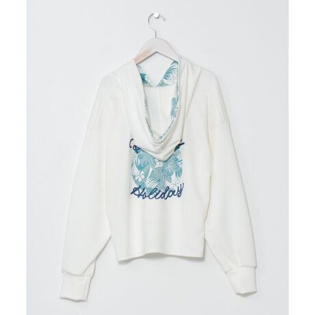 ハワイを感じさせるボタニカル柄のフード付プリントトップス。さらりととろけるような手触りが癖になる1枚です。背中にロープで刺しゅうされた「Hawaii Holiday」の文字や、フードの内側にまでデザインされたハワイ柄が魅力です。