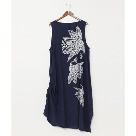 スペイン伝統の金銀細工、ダマスキナードにインスパイアされたワンピース。大胆なプリントに心惹かれる。サイドの紐を調節して変形シルエットとしても楽しめます。肌触りのいい綿素材が魅力。