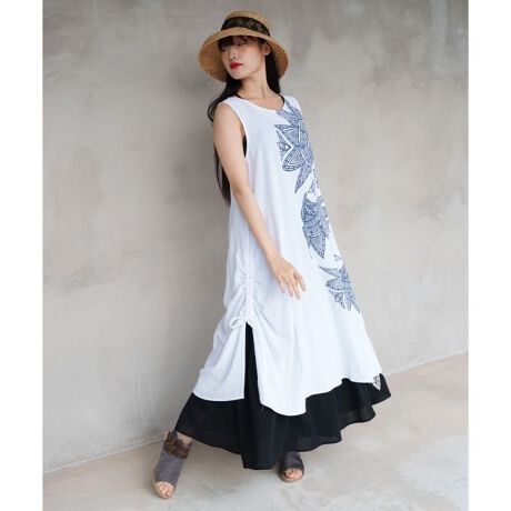 スペイン伝統の金銀細工「ダマスキナード」から着想したデザインワンピース。シルエットが個性的。サイドの紐で変形も楽しめる一着。柔らかく肌触りの良い綿素材。