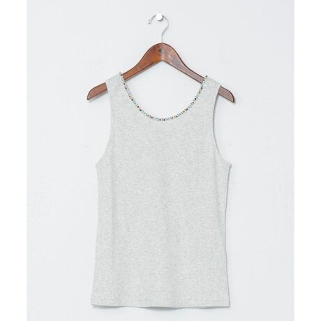 [型番:CCK-4101-2024]気分によってUネックとVネックが楽しめる2WAYスタイルのタンクトップ。体にフィットするリブ素材が気持ち良く、袖口も広く着脱もしやすいアイテム。光るビーズがアクセサリー感覚で楽しめる一枚。