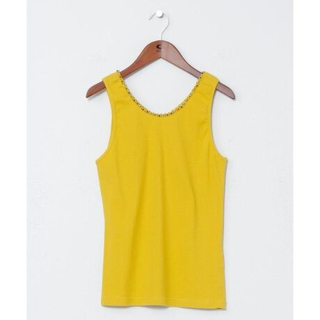 [型番:CCK-4101-2024]気分によってUネックとVネックが楽しめる2WAYスタイルのタンクトップ。体にフィットするリブ素材が気持ち良く、袖口も広く着脱もしやすいアイテム。光るビーズがアクセサリー感覚で楽しめる一枚。