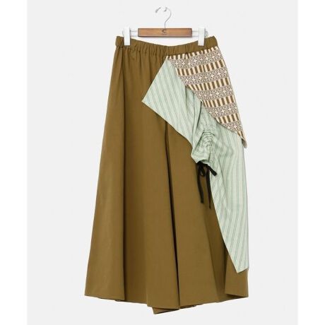 こだわりたっぷりの異素材を組み合わせたワイドパンツ。男らしさや英雄的な強さという意味を持つキリムの柄「羊の角」をあしらったジャカード素材が目を惹く。スカーフを巻きつけたかの様なアシンメトリーなデザインが特徴。ストライプ生地部の紐で好みに合わせてギャザーを調整する事で、洗練された雰囲気を引き立てます。ウエストはゴム仕様のフリーサイズ。片側サイドにポケット付き。