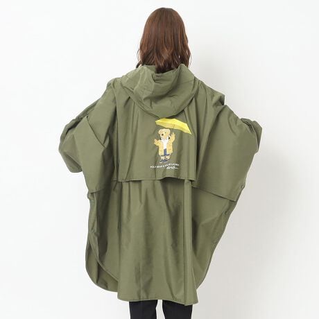 人気のポロベアがバックプリントになったレインポンチョ。フードとポケットがオシャレなミリタリー風シルエットが雨の日コーデをセンス良く格上げします。撥水加工を施していますので、通勤、通学にもおすすめ。付属のポーチはバッグに着けられますので携帯に便利です。