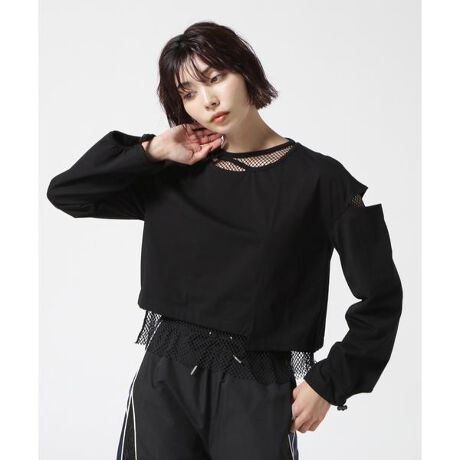 表着用:クロップド丈長袖Tシャツの襟ぐりや裾からメッシュが出るレイヤードスタイルに。長袖のスリットからメッシュが覗くのも拘りポイント。